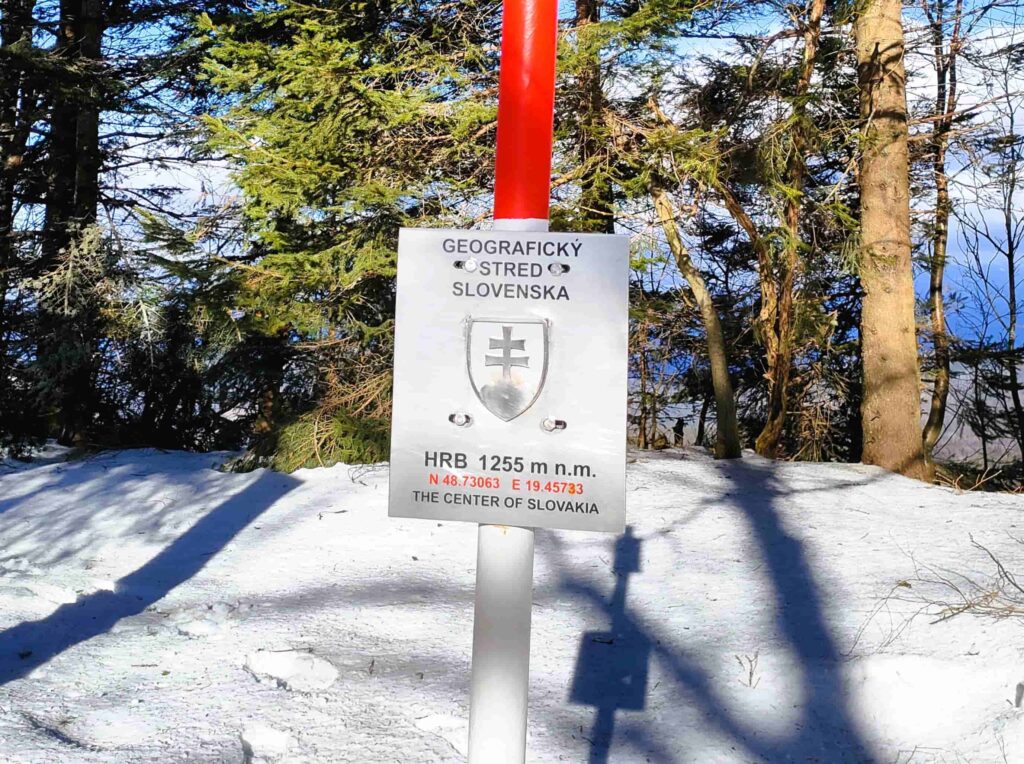 Stúpanie na Hrb je od začiatku záživné. Zvyšuje sa kadencia namrznutých úsekov a tým aj šanca na to, aby sme spravili nechceného dvojitého Salchowa. Len tak dozadu na kamene s fraktúrou niečoho. Pasáže zdolávame a ideme okolo masívneho skalného brala predstavujúceho Hrb. Prekonávame posledné výškové metre a dostávame sa k turistickému smerovníku s názvom „Hrb“ a výškou 1 255 m n. m. Pokračujeme ešte o pár desiatok metrov ďalej a sme pri označení geografického stredu Slovenska. Tu je aj výhľadový bod, vďaka ktorému môžeme pozorovať Veľkú Fatru, Nízke Tatry, či Veporské vrchy.