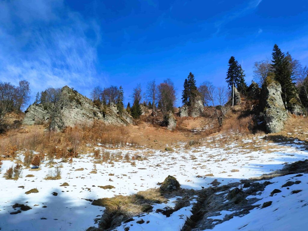 Ako vychádzame z lesa, dostávame sa na čistinku, kadiaľ nevedie žiadna trasa. Je tu iba diétne vychodený chodník, a tak dávame pozor, aby sme nešli zlým smerom. Klesáme popri prírodnej pamiatke Veporské skalky. Ide o skalné výtvory pripomínajúce zrúcaninu hradu, resp. pozostatky hradieb. Niekto v minulosti premrhal potenciál vystavať úžasný hradný komplex. Z tohto prírodného unikátu sme unesení viac než majitelia BMW pri povinnosti používať smerovky.